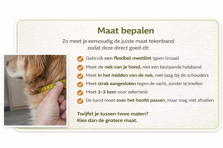 De tekenband kan eenvoudig om de nek van jouw hond worden gedaan zoals een normale halsband. Zorg ervoor dat de band comfortabel zit: niet te strak, maar ook niet zó los dat hij kan afvallen. Een vuistregel: twee vingers moeten tussen de band en de hals passen.