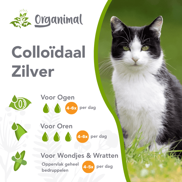 Organimal colloïdaal zilver is uitermate geschikt voor langdurige toepassing voor ogen, oren en huid (met uitzondering van lage traanvochtproductie).Echter, wanneer er een noodzaak is tot langdurig gebruik duidt dat ook op een structurele onbalans bij jouw kat. In dat geval raden wij je aan om in aanvulling op Organimal colloïdaal zilver, de oorzaak te onderzoeken. Een dierenarts kan je hier eventueel bij helpen.